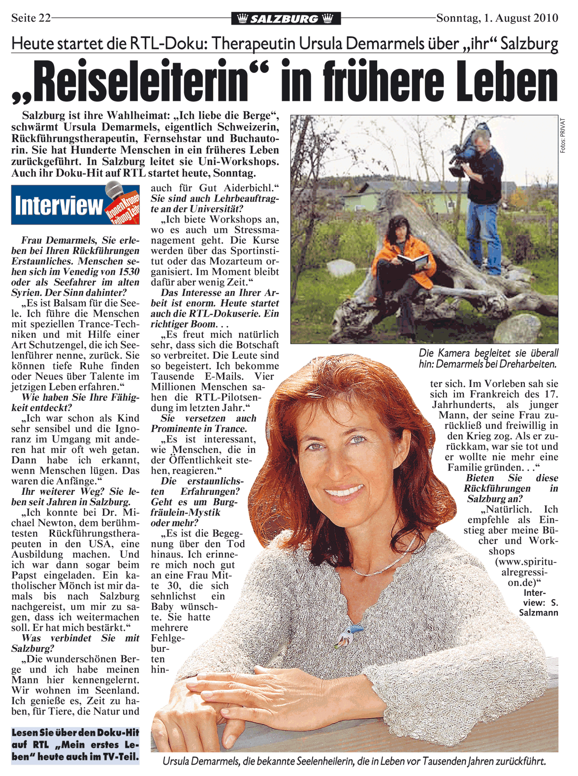 Reiseleiterin in frühere Leben. Interview mit Ursula Demarmels von Mag. Sabine SALZMANN in der größten österreichischen Tageszeitung, der Kronenzeitung, Ausgabe SALZBURG-KRONE (1.8.2010, 22; gif, 613 kB)