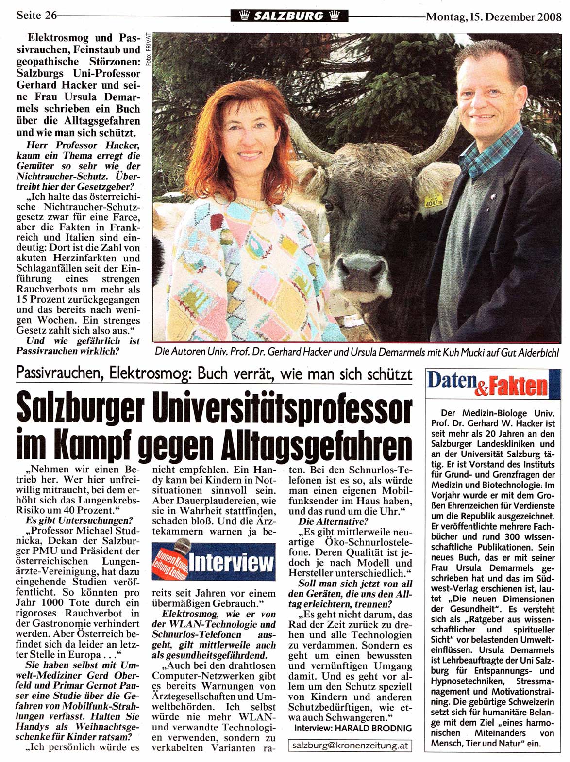 Bericht über das Buch "Die neue Dimension der Gesundheit" (Univ.-Prof. Dr. Gerhard W. Hacker & Ursula Demarmels) in der Kronenzeitung / Ausgabe SALZBURG-KRONE von Redakteur und Chef vom Dienst Harald BRODNIG (15.12.2008; jpg, 438 kB)