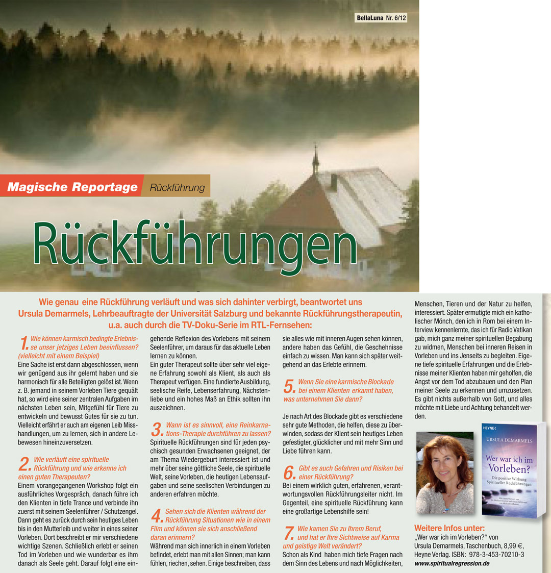 Wie verläuft eine spirituelle Rückführung und was verbirgt sich dahinter? Interview von Ulrike Anna RENSCH mit Ursula Demarmels in der Frauenzeitschrift BELLA LUNA (6/2012, 50-51; pdf, 359 kB)