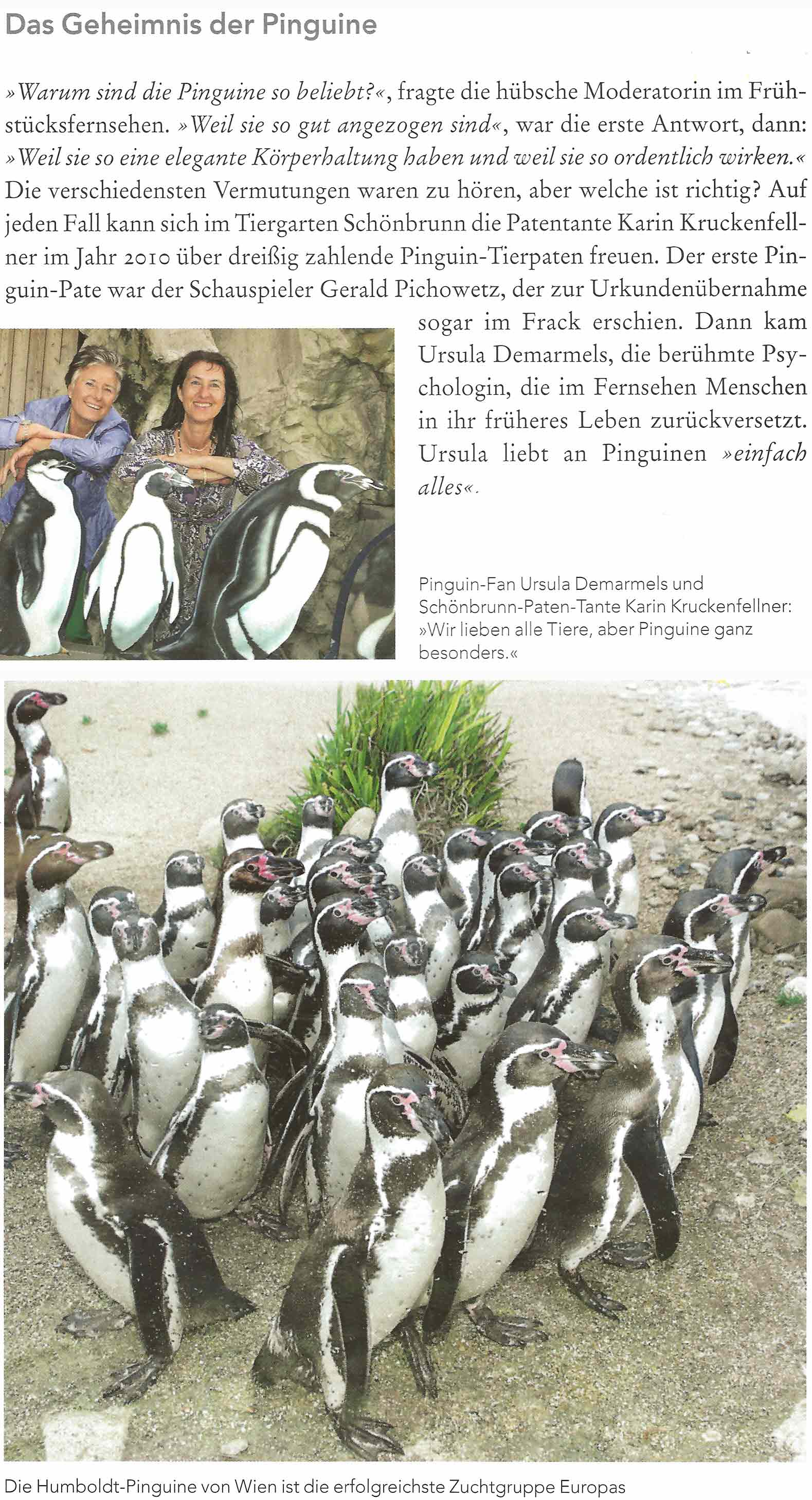 In seinem Buch "Von lachenden Zebras und verliebten Löwen. Die schönsten Tiergeschichten aus alter und neuer Zeit" (Amalthea-Verlag, ISBN 3850027414) schreibt Prof. Gerhard KUNZE über die Patenschaft eines Humboldtpinguins von Ursula Demarmels (11/2011; jpg, 360 kB)