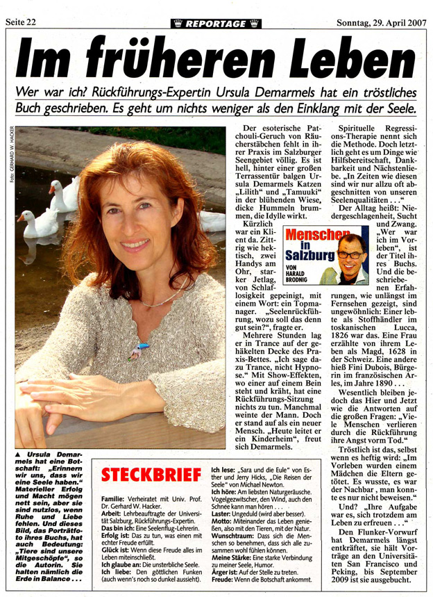 Portrait über Ursula Demarmels in der größten österreichischen Tageszeitung, der Kronenzeitung / Ausgabe SALZBURG-KRONE von Redakteur und Chef vom Dienst Harald BRODNIG (29.4.2007; jpg, 288 kB)